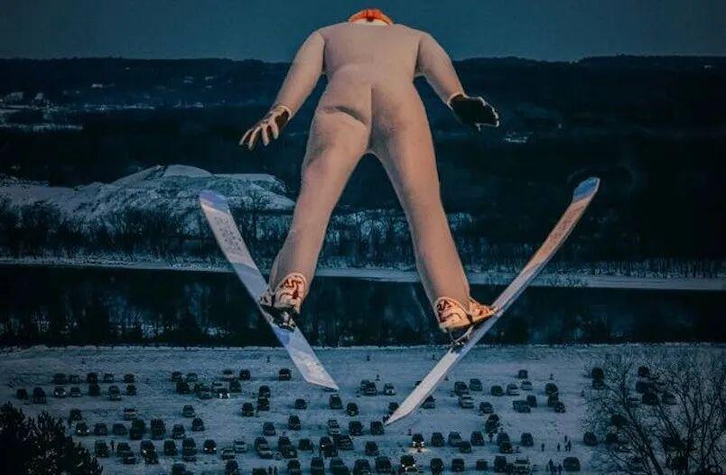 随后凭着惯性从跳台边缘一跃而出,在空中滑翔一段距离后,最后降落到雪地上。