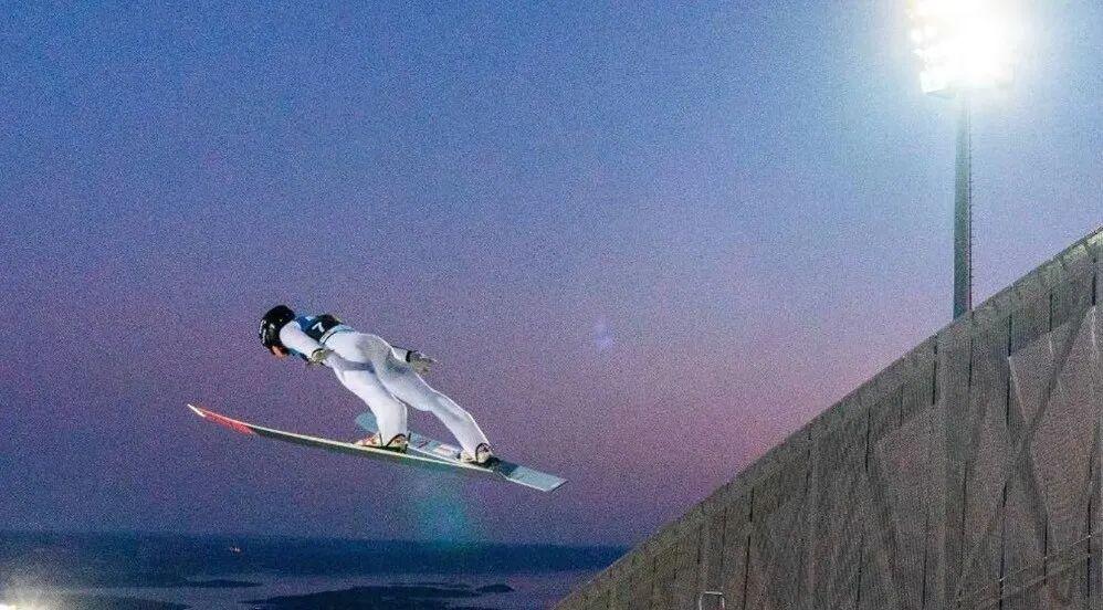 随后凭着惯性从跳台边缘一跃而出,在空中滑翔一段距离后,最后降落到雪地上。